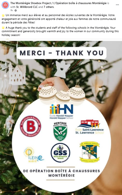 Our 3C & 4C classes participated in the Montérégie ShoeBox Project this year. They made 10 shoeboxes for women’s shelters in the area. Thank you to everyone who donated. Well done 3C & 4C!
