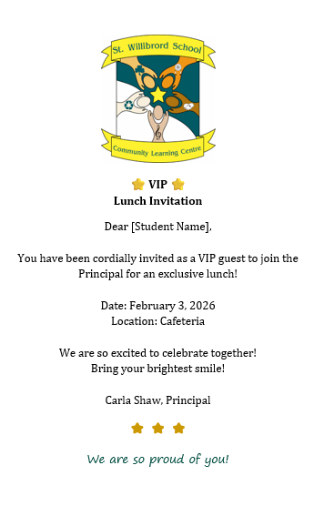 Ce mois-ci encore, chaque classe a eu un invité de marque invité à déjeuner avec le Proviseur le 3 février. Félicitations à ces invités de marque qui sont identifiés pour leurs contributions positives à notre école et à l'environnement d'apprentissage de leur classe ! Nous sommes fiers de vous tous les jours. Merci d'avoir célébré l'événement par une danse le long du parcours, une pizza, un souvenir et vos plus beaux sourires ! Merci à notre OPP pour son soutien et ses bénévoles !